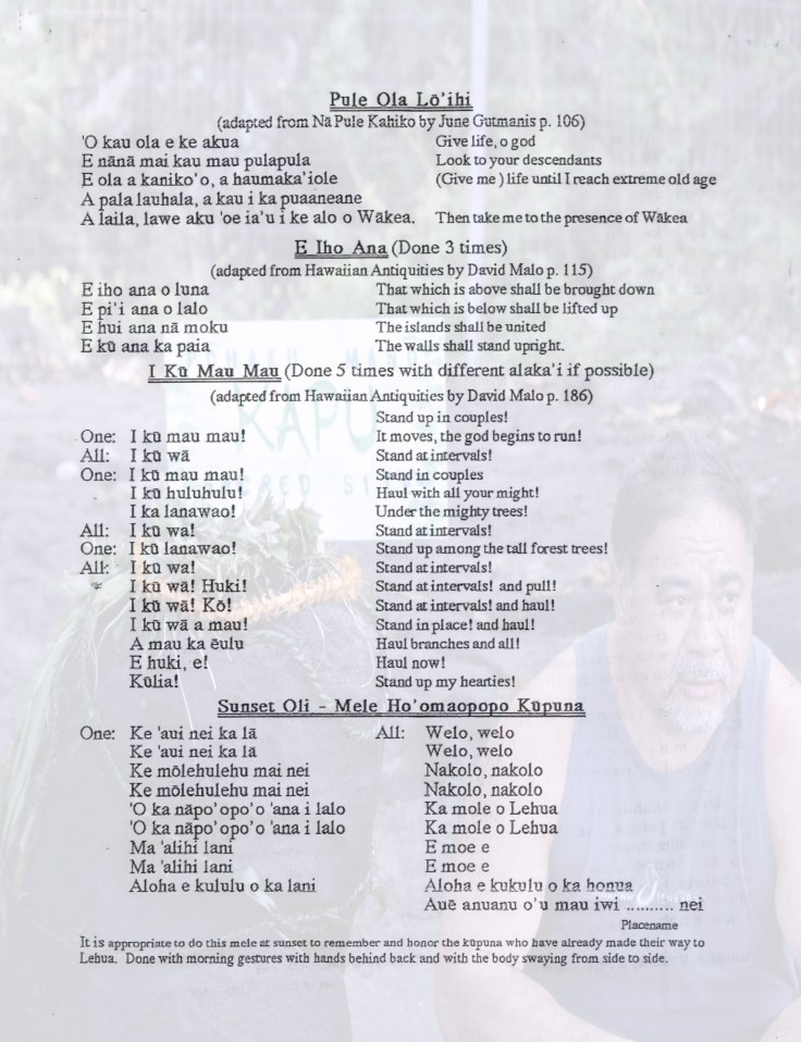 When Protect Keopuka Ohana held the three day Vigil for Pu’u Ohau in September 2003, Hawaiian practitioners came together on the hour, every hour day and night for the three days to perform the chants published here. Surrounded by the ancient gravesites of hundreds of these individual’s own ancestors, they chanted for the kupuna to rise and join with them in prayer. The dark starlit nights were swept with occasional wind and rain as the spirit energy gained momentum hour by hour, prayer by prayer. And their prayers were answered as the kupuna rose and let themselves be heard to their devoted children.